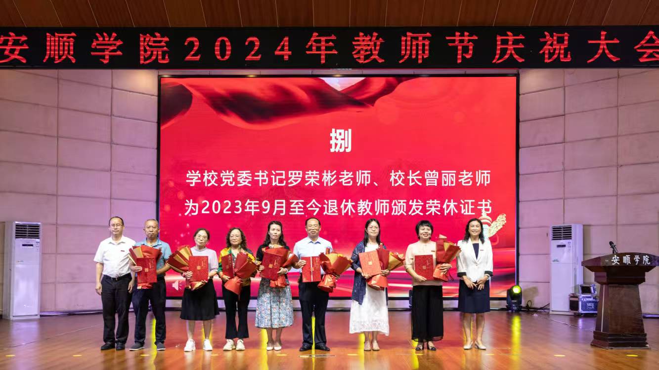 安顺学院党委书记罗荣彬、校长曾丽为优秀教师、教育工作先进个人、师德标兵及师德师风建设先进集体颁发荣誉证书,为2023年9月至今退休教师颁发荣休证书。安顺学院副校长张来为2024年教龄三十年的教师颁发荣誉证书。